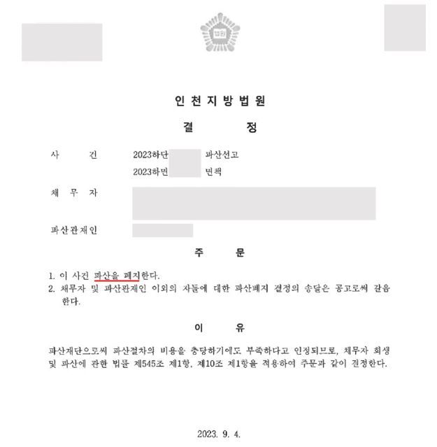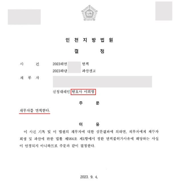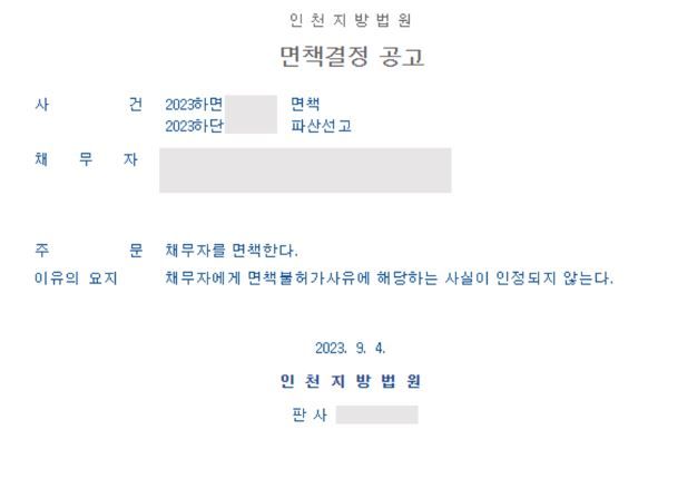 또한 연대보증 채무의 경우 피보증인인 법인이 폐업하여 송달이 불가하였기에 법인 주소지, 법인대표 주소지, 대표청산인 주소지 등으로 송달을 시도하였고, 수차례의 걸친 송달이 폐문부재, 수취인불명, 이사불명 등으로 도달되지 않아 법원에 송달에 갈음하는 공고 신청서를 제출하여 허가를 받았고, 신청한지 7개월 만에 동시폐지 및 면책 결정을 받을 수 있었습니다.