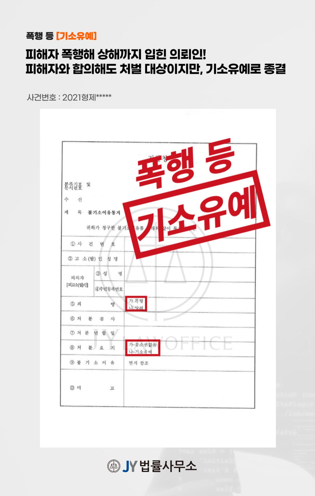 이로써 의뢰인은 변호인의 조력에 따라 폭행 혐의에 대해서는 '공소권 없음'을, 상해 혐의에 대해서는 '기소유예' 처분을 받고 사건을 무사히 종결할 수 있었습니다.