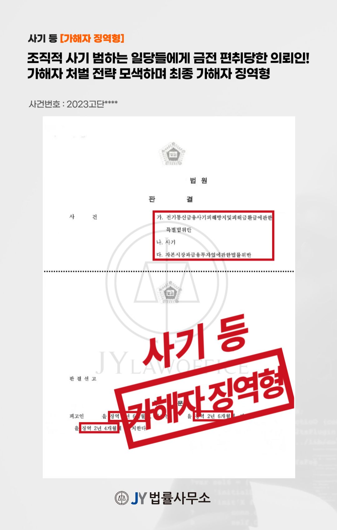 본 사건의 의뢰인은 조직적으로 사기를 범하는 일당에게 수 백만 원의 금전을 편취당했고, 이를 해결하기 위해 본 JY법률사무소를 찾아주셨습니다.