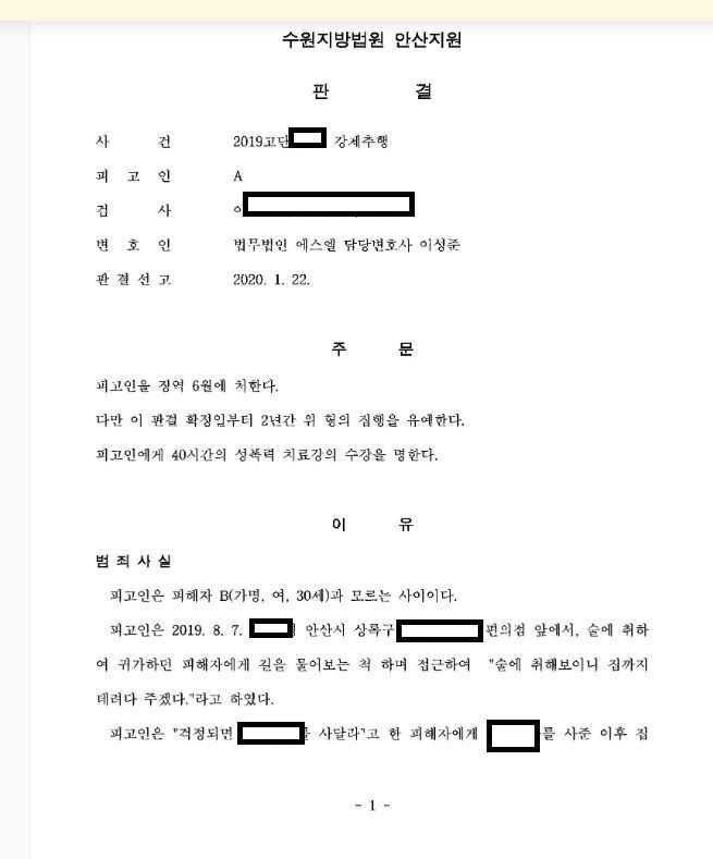 의뢰인께서는 처음보는 여성에게 대화를 시도한 후 집으로 데려다 주겠다고 하여 집으로 데려다 주던 중 스킨 십을 하기 위해 골목길로 여성을 데리고 들어갔습니다. 여성은 곧바로 거부의사를 밝혀서 빠져나올 수 있었으나 그 과정에서 물리적 충돌이 있었기에 단순 강제추행보다는 강간미수가 걱정되는 사건이었습니다. 그러나 여성을 골목길로 데리고 가는 과정을 강간의 실행의 착수로 보기어렵다는 주장을 받아들여 강간미수로는 의율되지 않았고 강제추행으로만 처벌되어 다행히 집행유예의 선처를 받을 수 있었습니다.