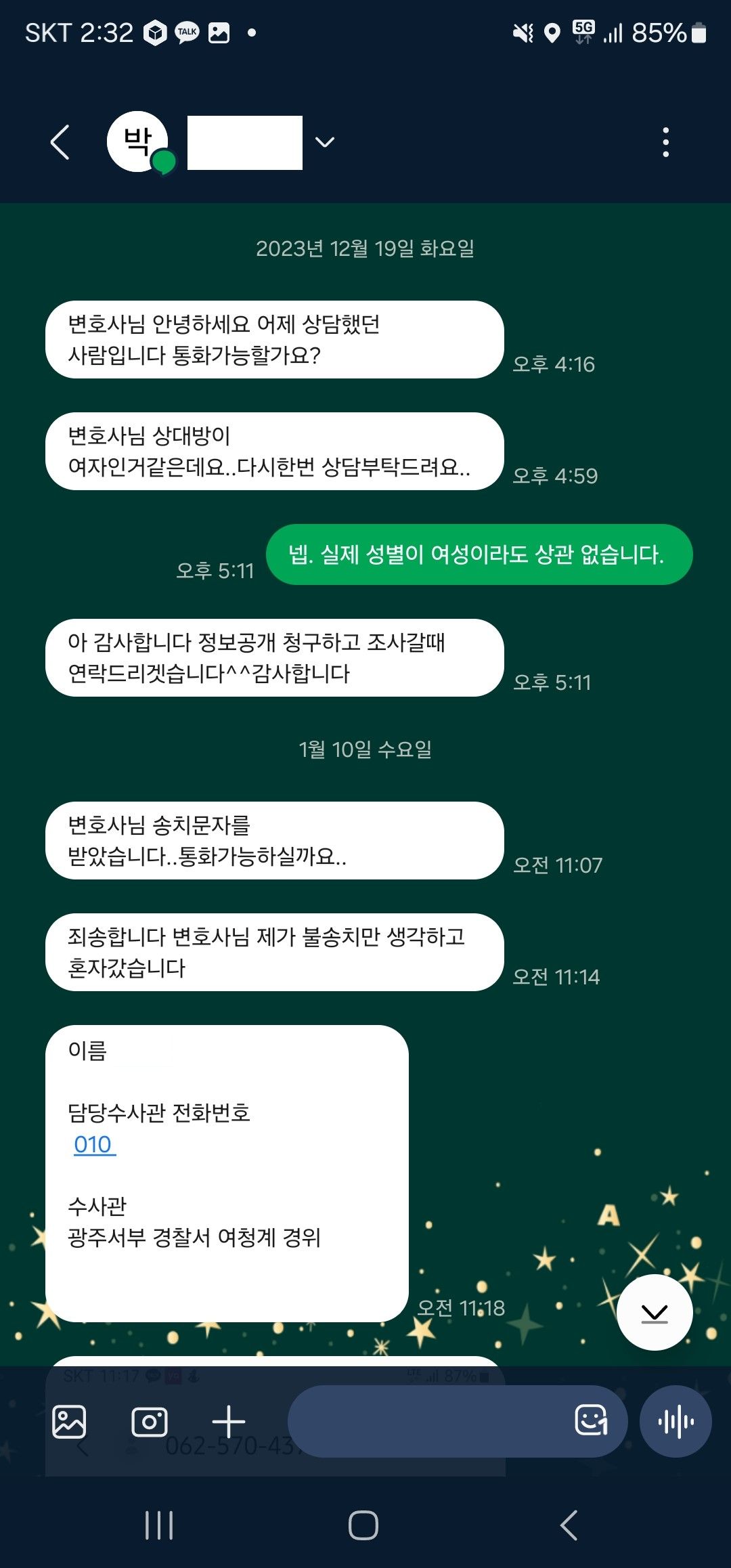 이후 피의자는 24년 1월 10일 저에게 연락하여 송치가 되었다면서 무혐의처분을 받아달라고 부탁 하였고, 이에 저는 의뢰인님이 요청하신대로 무혐의처분을 받아 드렸습니다만,