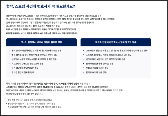 더하여 실무상 스토킹 범죄를 저지른 경우 대게 협박죄, 명예훼손, 모욕죄 등까지 추가 혐의가 적용되는 사례가 많습니다.