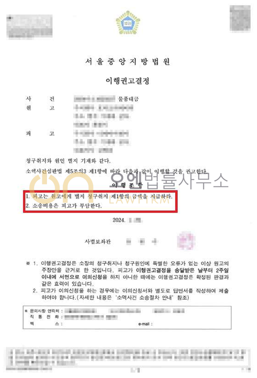 재판부에서 원고의 주장이 타당하다고 판단하고 이행권고결정을 내렸고, 상대방측에서 이의를 하지 않아 그대로 확정되었습니다. 확정된 이행권고결정은 승소 확정판결과 동일한 효력이 있어서 의뢰인은 강제집행을 할 수 있게 되었습니다.