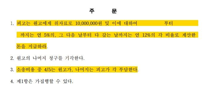 재판부는 원고가 남편으로부터는 소액의 위자료를 지급받고 조기에 조정한 것을 설시하며, 의뢰인의 위자료 책임을 1,000만 원으로 인정하였고, 소송 비용 또한 원고가 더 많은 비율로 부담하는 것으로 판단하였습니다. 의뢰인은 원고에게 1,000만 원을 지급하는 것으로 위자료 액수를 방어하고 소송 비용 또한 원고에게 청구할 수 있게 된 것에 크게 만족해 하였습니다.