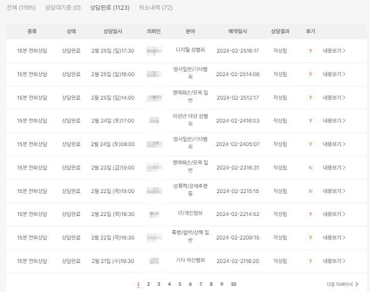 감사하게도 위 화면과 같이 지난 1년 간 약 1123명의 의뢰인 분들께서 저를 믿고 찾아주셨고(중복 포함), 하루 평균 약 3번 정도 상담을 진행하였던 것 같습니다.