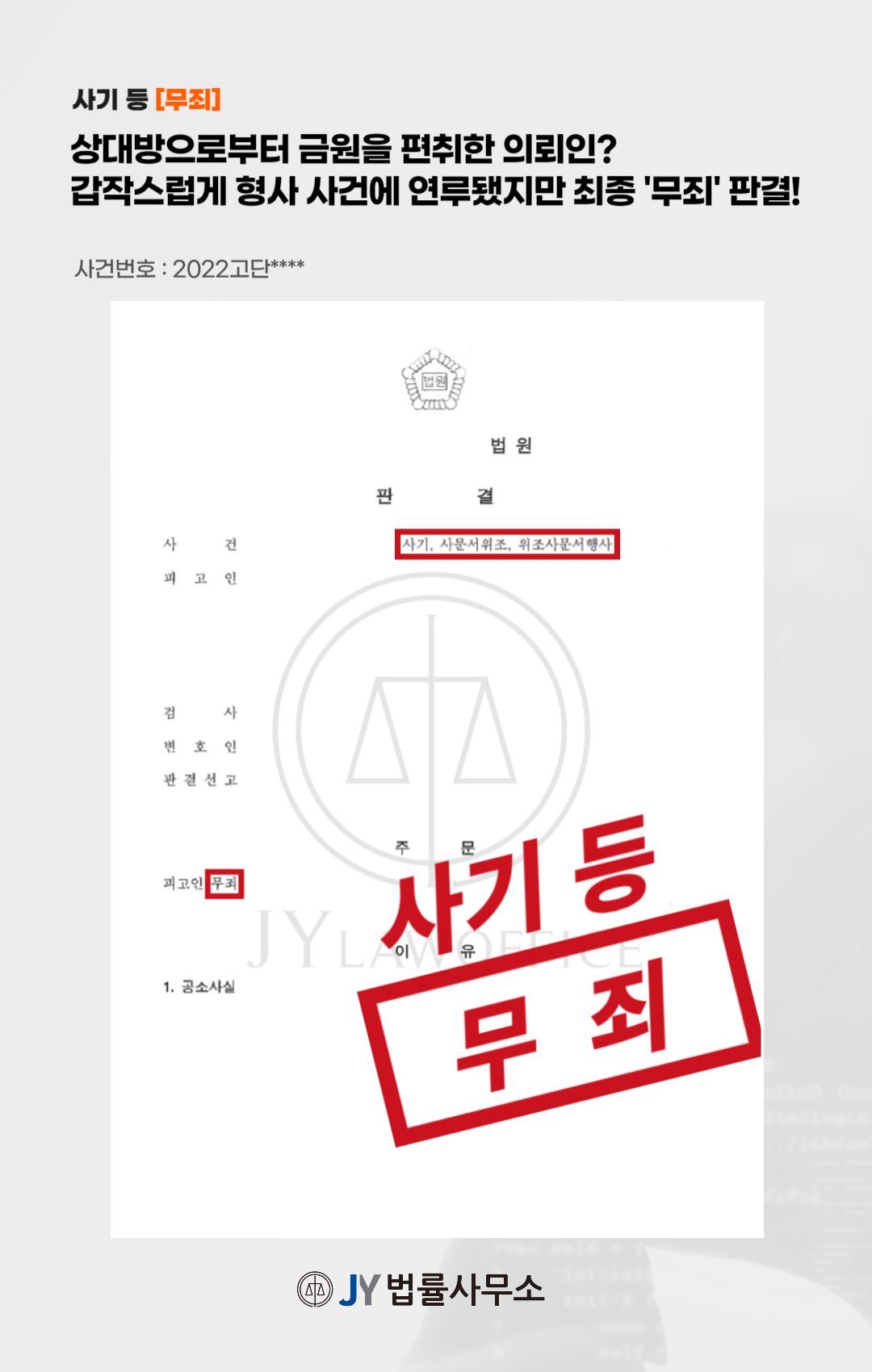의뢰인의 행위는 피해자들을 기망하는 행위임이 분명하나, 범행의 고의성과 목적성이 없음은 물론, 자신의 행위가 범죄에 해당한다는 사실조차 인지하지 못하였으므로 이를 근거로 의뢰인의 무고함을 적극 주장하는 것이 중요했습니다. 이에 본 변호인은 범죄의 특성과 고소의 내용 등을 종합적으로 살펴보고, 의뢰인에게 사기의 혐의가 없다고 판단하였고, 이외에 사문서위조, 사문서 행사 부분에 대해서도 정상적인 업무 서류로 판단하여 이행하였을 뿐, 이 역시 범죄 행위임을 인식할 수 없었다는 점을 적극 주장하였습니다.
