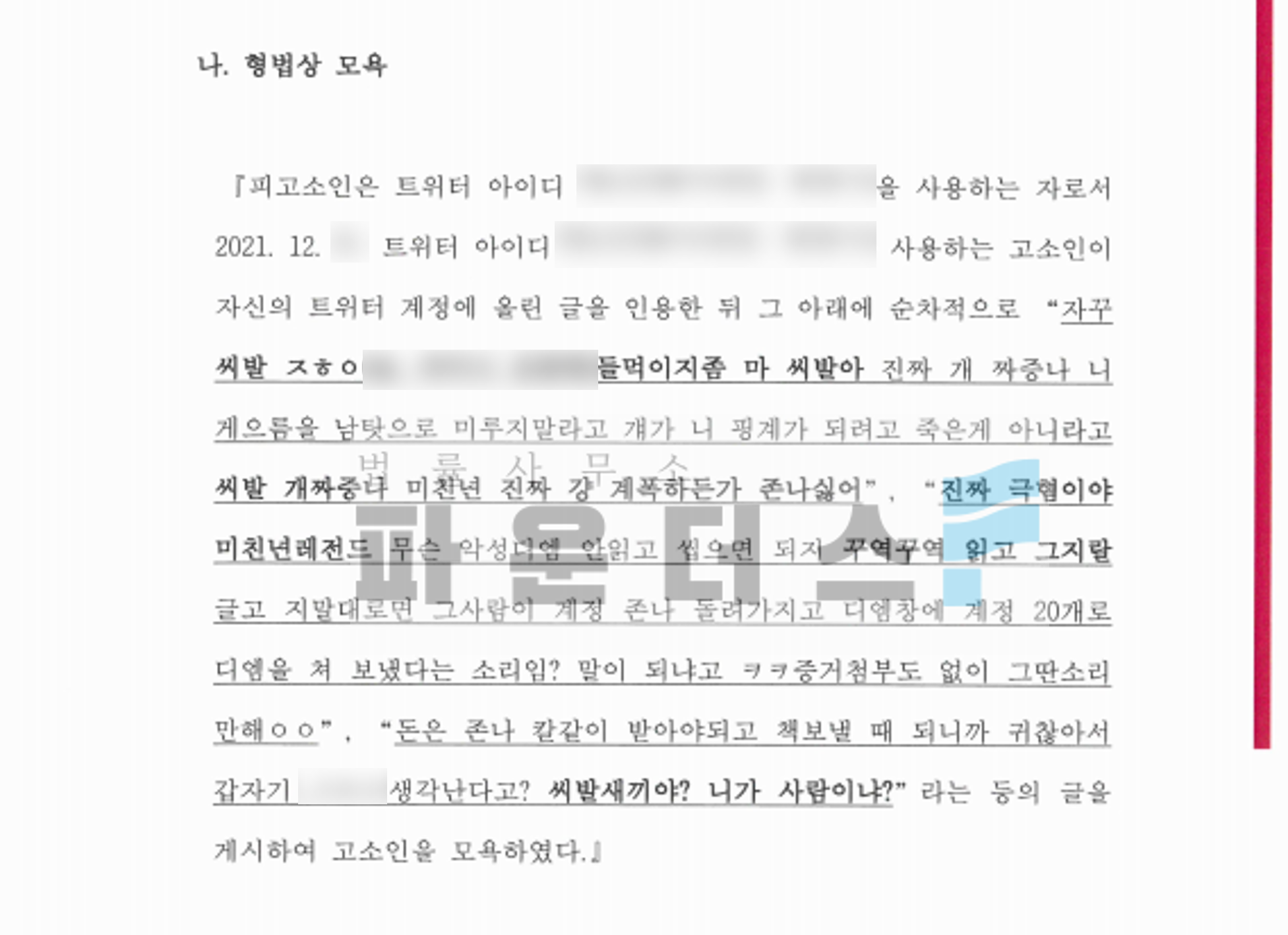 "트위터 내에서 제가 작성한 글을 인용하여 욕설 작성 등의 사이버불링. 모욕죄 고소 진행하고 싶습니다."