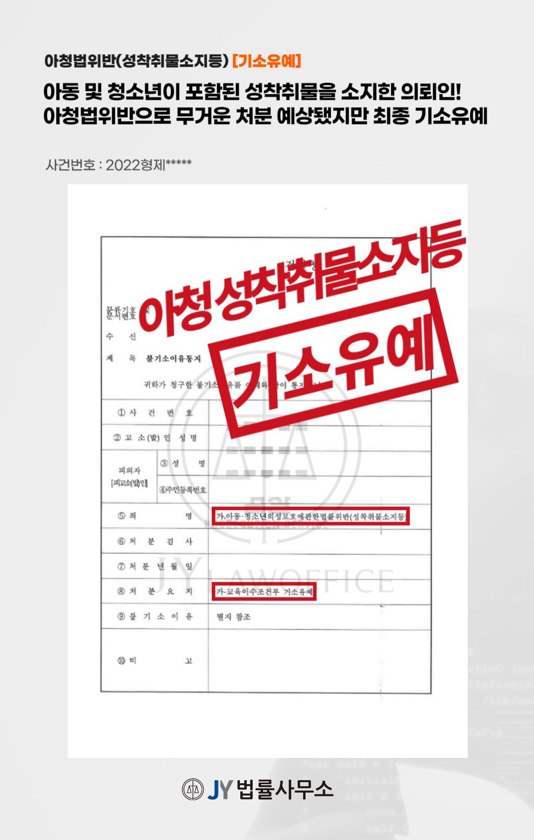이와 같은 변호인의 노력에 따라, 의뢰인은 음란물사범 재범방지 교육프로그램 이수를 조건으로 '기소유예' 처분을 받고 사건을 무사히 종결시킬 수 있었습니다.