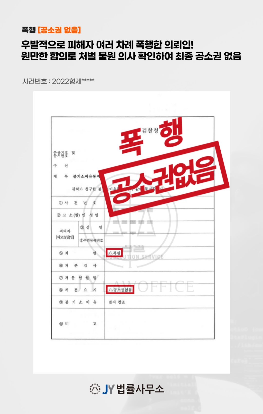 이와 같은 변호인의 조력에 따라, 의뢰인은 공소권 없음 처분을 받고 무사히 사건을 종결할 수 있었습니다.