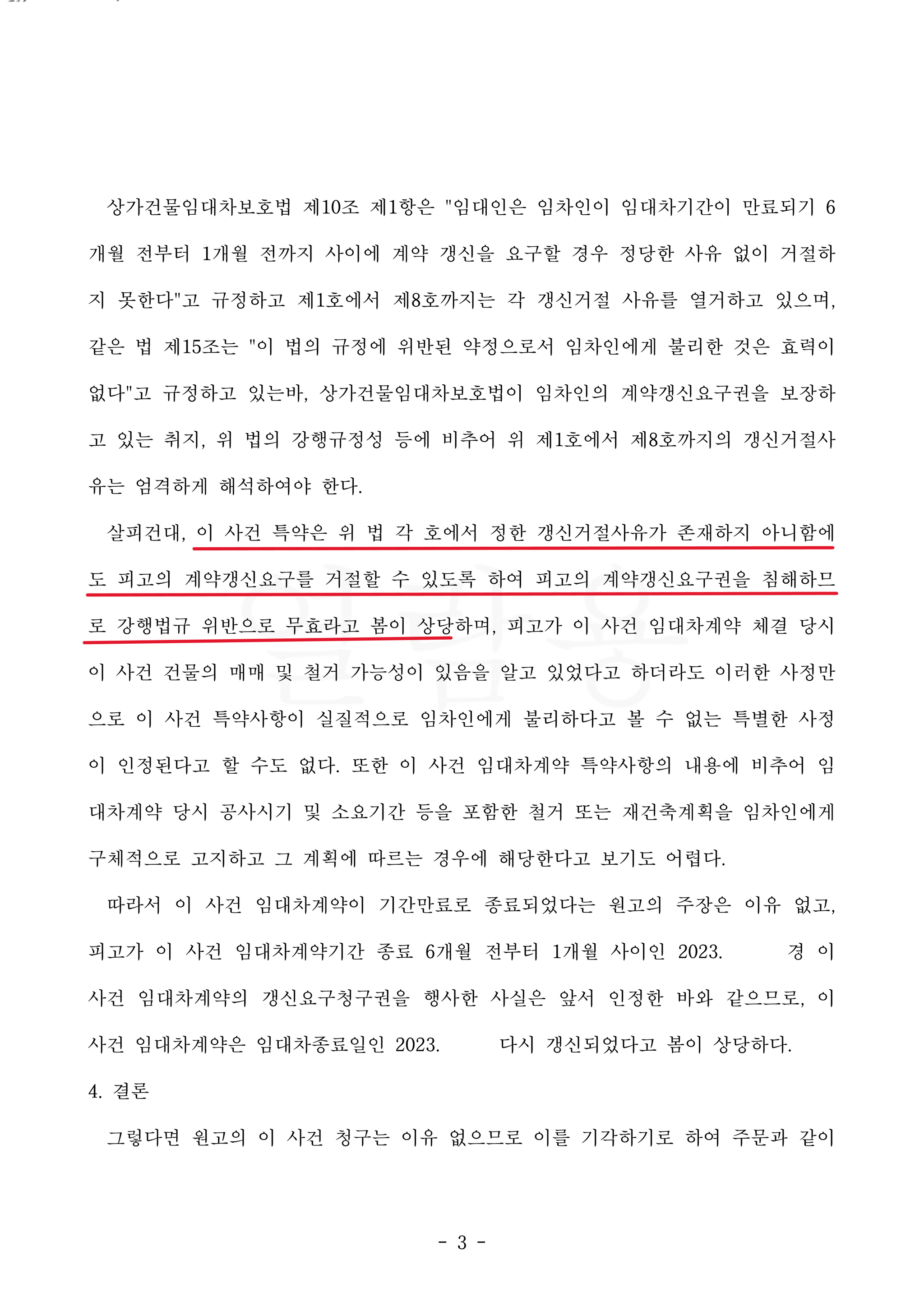 그러나 걱정한 것과 달리 재판부는 위 특약이 상가임대차법에서 규정하는 강행규정에 위반하여 무효라고 보았고, 임대인이 의뢰인의 계약갱신요구권 행사를 거절한 것은 부적절하다고 판단하여 피고 전부 승소 판결을 내렸습니다.