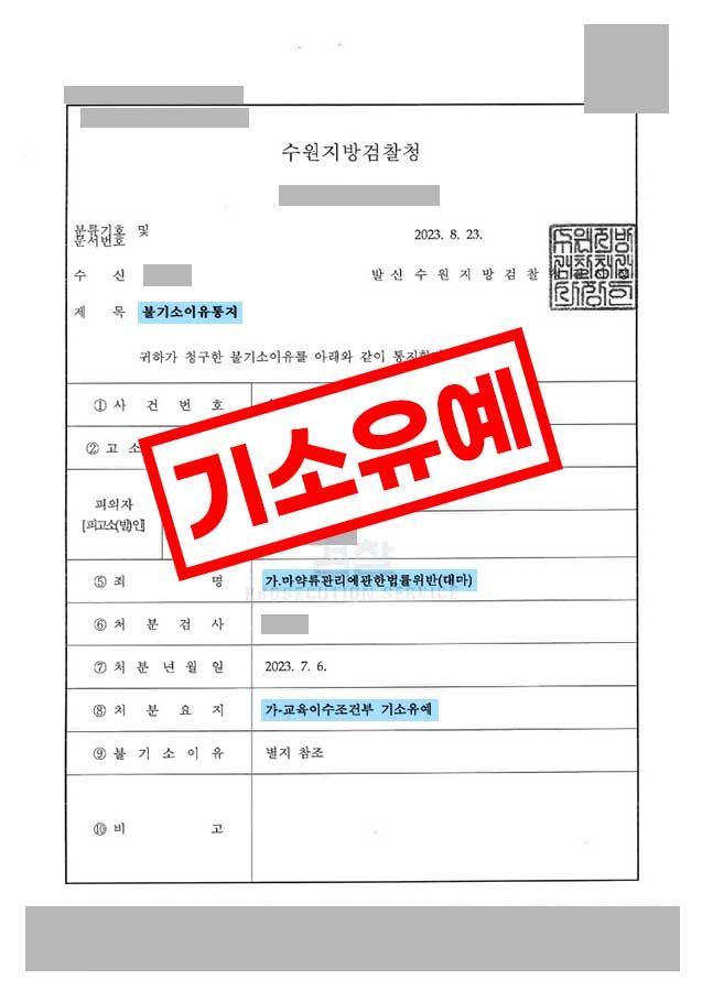 1건의 매수, 흡연 행위 만으로 사안이 축소되었고, 해당 건은 마약퇴치본부의 교육이수조건으로 기소유예 판결을 받을 수 있었습니다.