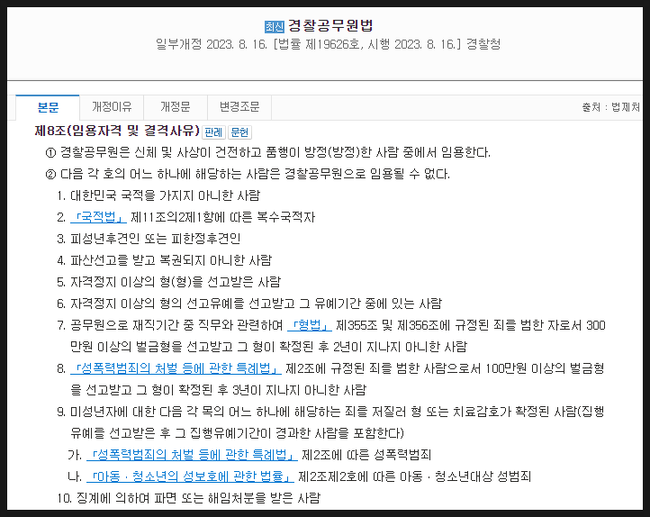 경찰공무원법은 국가공무원법상 임용결격 사유와 대체로 유사합니다.