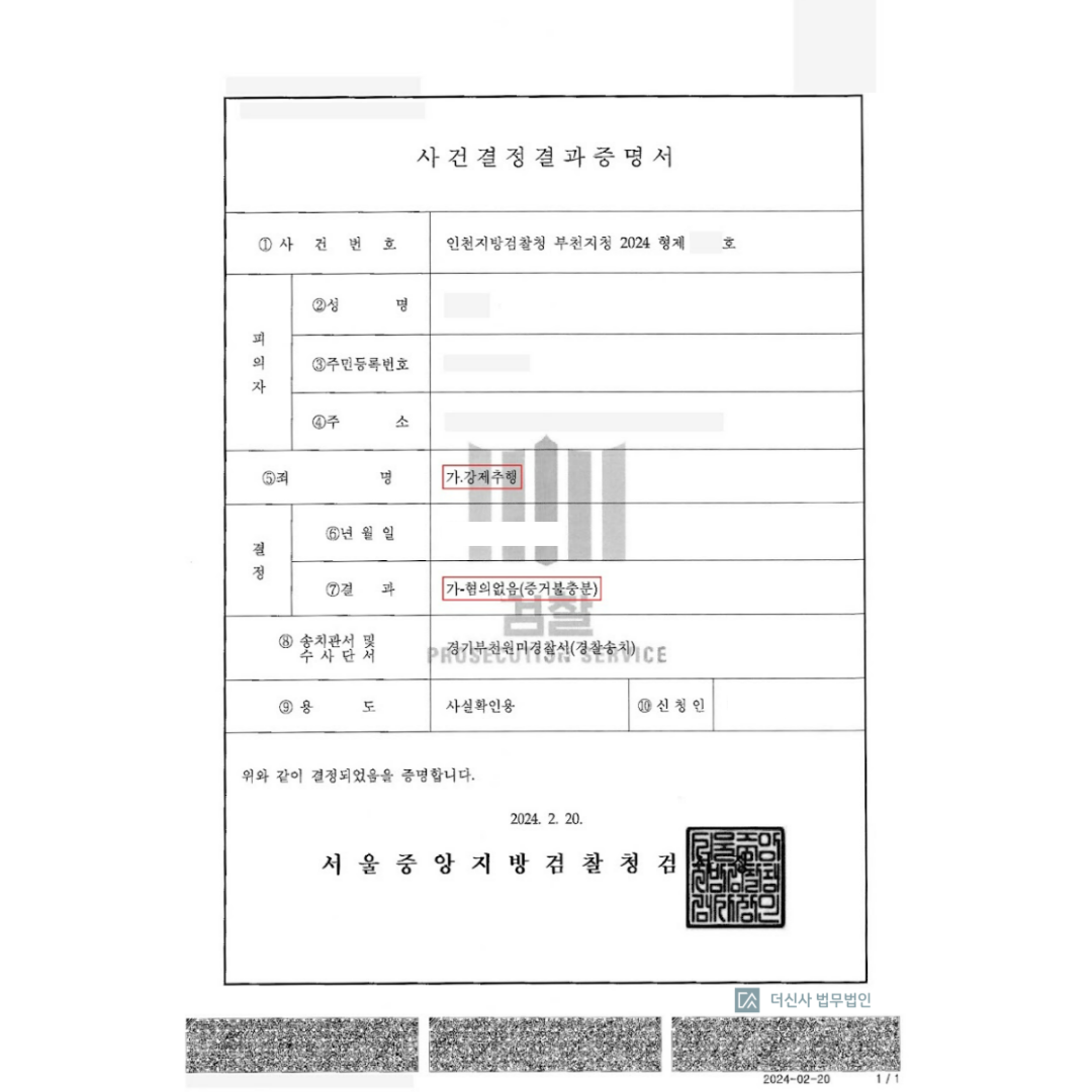 의뢰인은 강제추행의 죄에 대하여 증거불충분으로 혐의없음 판결을 받았습니다.