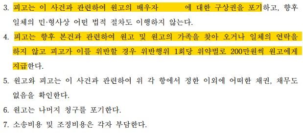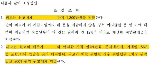 결국, 상간자가 의뢰인에게 위자료 1,800만 원을 지급하고, 남편에 대한 구상금 청구를 포기하며, 향후 남편과 만남을 이어갈 시 1회당 위약벌로 200만 원씩, 원고 가족을 찾아오는 경우 1회당 위약벌로 200만 원씩을 지급하는 내용으로 조정 성립하였습니다. 이 사건은 의뢰인이 원하였던 위약벌 조항이 추가되었다는 것 뿐만 아니라 상간자가 남편에 대한 구상금까지 포기하는 것을 약속하였다는 점에서 의미가 있는 사안입니다.