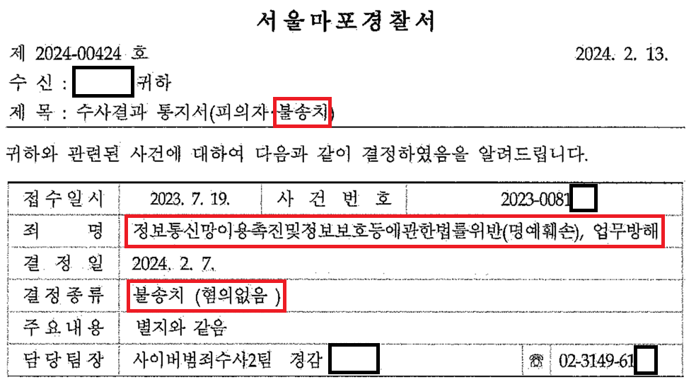 그러자 경쟁업체는 의뢰인을 정보통신망법위반(허위사실 적시 명예훼손), 업무방해로 고소하였습니다.
