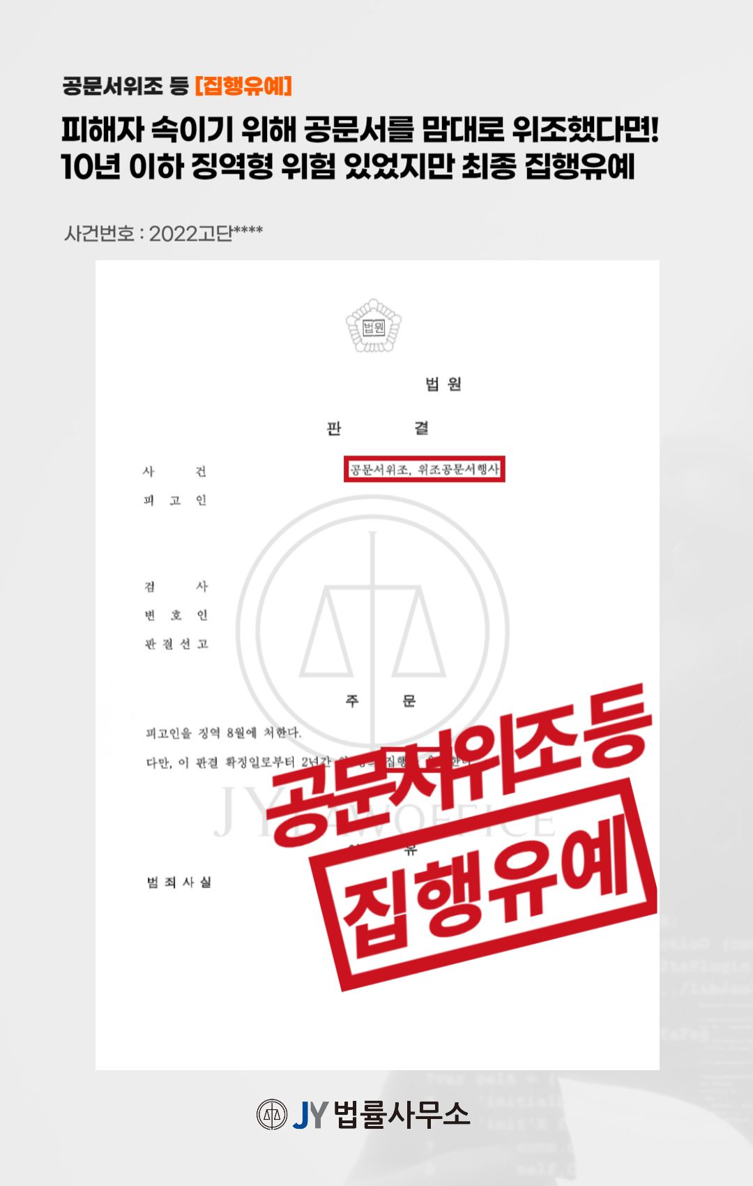 본 사건의 의뢰인은 타인을 속이기 위한 목적으로 공문서를 위조 및 행사하였습니다. 이로 인해 '공문서위조', '위조공문서행사'의 혐의를 받게 된 의뢰인은 당황스러운 마음에 JY법률사무소를 찾아 도움을 받기로 결심하였습니다.