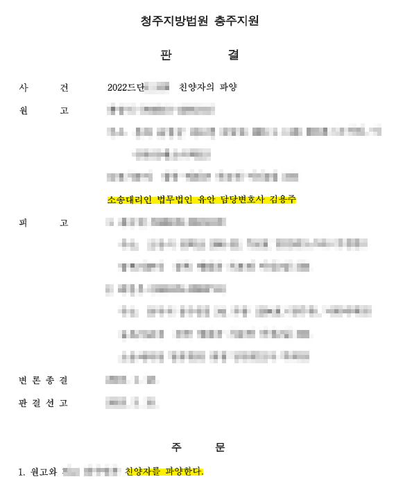 재판부에서는 이러한 주장을 모두 받아들여 의뢰인의 파양 청구를 인용하였습니다.