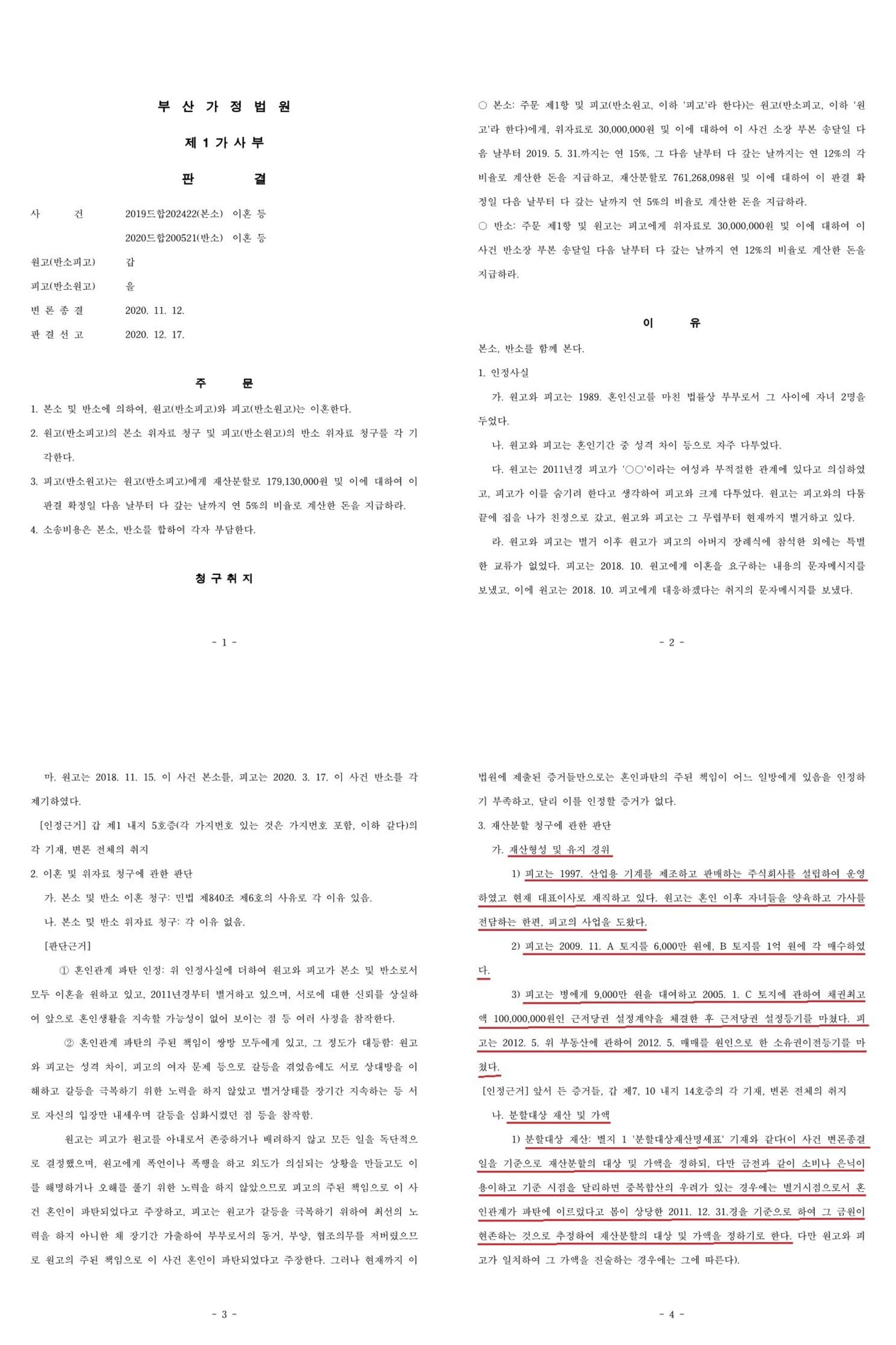 [파탄시기 이후 취득한 재산 및 발생한 채무에 관하여 재산분할대상에 제외한 하급심 판례 : 부산가정법원 2020. 12. 17. 선고 2019드합202422 판결]