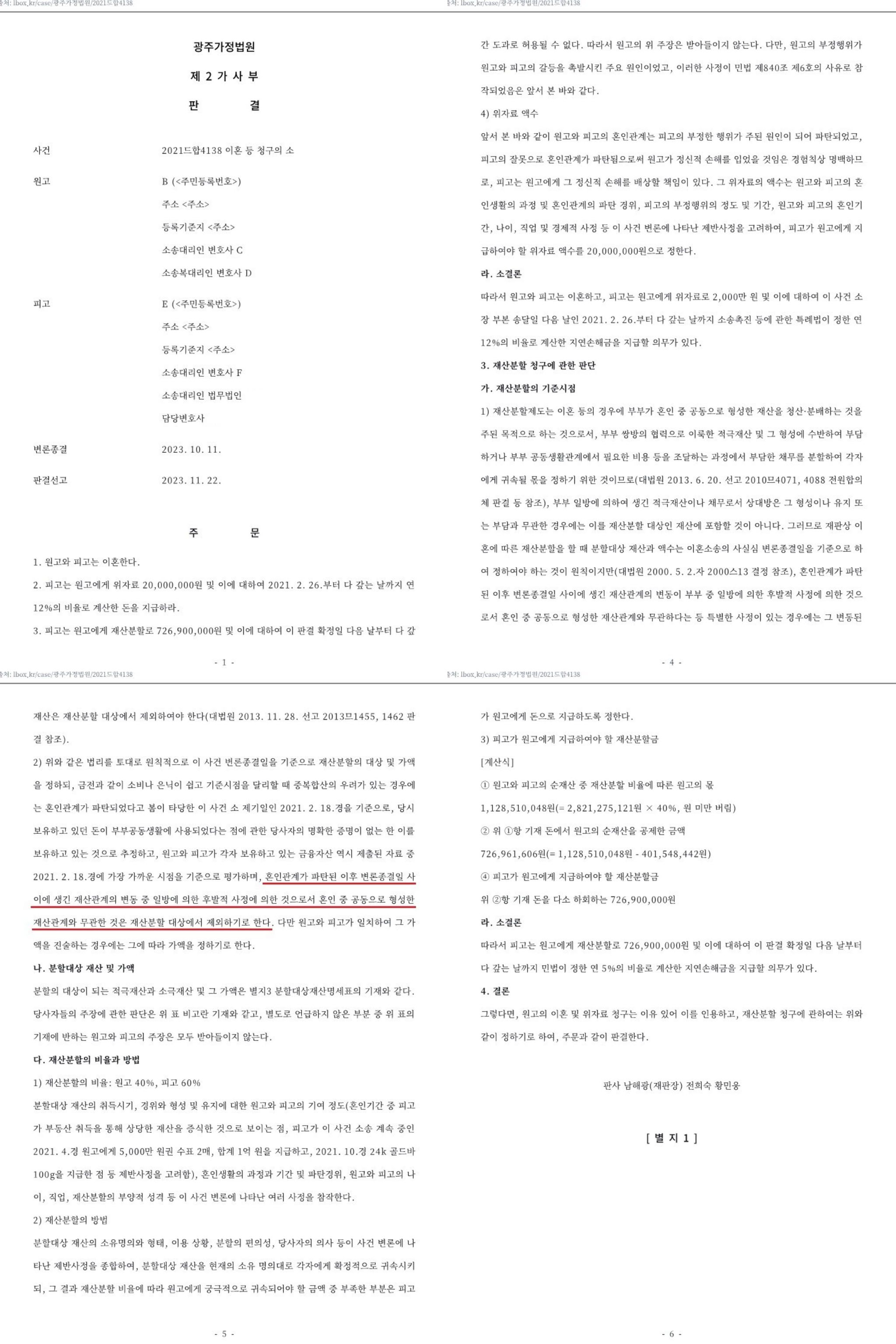 [혼인관계 파탄 이후 변론종결일 사이에 생긴 재산관계의 변동 중 일방에 의한 후발적 사정에 의한 재산은 재산분할 대상에 제외한 사례 : 광주가정법원 2023. 11. 22. 선고 2021드합4138 판결]