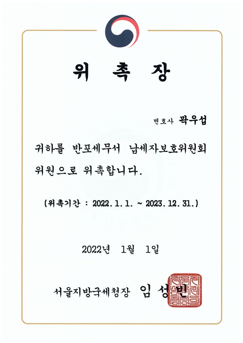 안녕하세요, 오늘은 제가 2022년도 및 2023년도 서울반포세무서 납세자보호위원으로 위촉되었었음을 말씀드리고자 합니다.