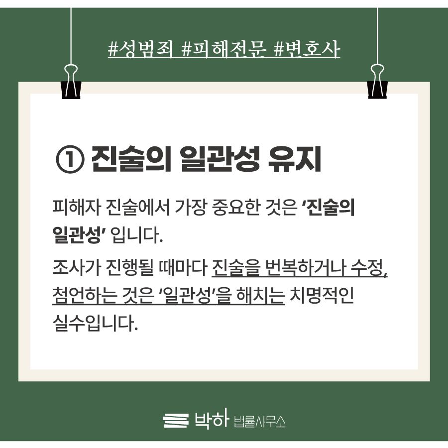 피해자 진술에서 가장 중요한 것은 '진술의 일관성'입니다. 말 그대로 처음 진술한 내용이 시간이 지나도 유지되어야 하는데, 진술이 달라지거나 말에 살이 붙을 경우 진술의 일관성이 없다고 판단됩니다. 이러한 진술의 일관성 훼손은수사기관 및 법원에서 피해자 진술의 신빙성이 떨어진다고 판단하는 근거가 됩니다. 그렇기 때문에 초기 진술부터 정확하고 상세하게 진술하여 번복하거나 수정, 첨언하는 상황이 발생하지 않도록 유의해야합니다.