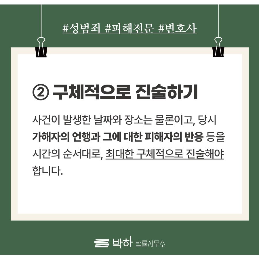 앞서 말한 바와 같이, 진술의 일관성을 유지하기 위해서는 초기 조사 때부터 가능한 구체적이고 상세하기 진술하는 것이 중요합니다. 사건이 발생한 날짜, 시간, 장소는 물론이고 당시 가해자의 언행과 그에 대한 피해자의 반응 등을 사건의 순서대로 진술해야 합니다.