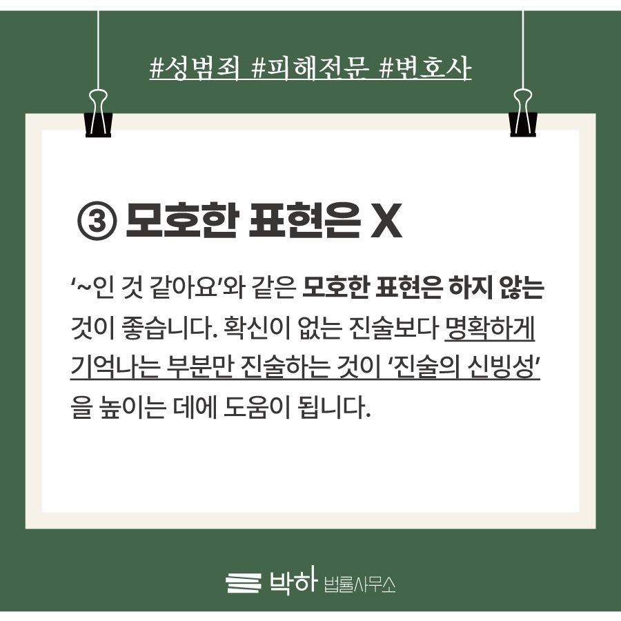 정신적인 충격 때문에, 이미 오랜 시간이 지난 후라서, 등의 이유로 많은 피해자분들은 피해 당시 상황을 정확히 기억하지 못하는 경우가 많습니다. 이럴 때 흔히 하는 실수가 "~인 것 같다", "~한 듯한 느낌이다"등과 같이 모호한 표현을 반복적으로 쓰는 것입니다. 이와같은 표현들을 반복적으로 사용하면 피해자 스스로도 확신이 없어 보이며, 피해자의 진술이 유일한 증거인 상황이라면 수사관은 더더욱 피해자의 진술이 사실인지 의구심을 가질 수 밖에 없을 것입니다.