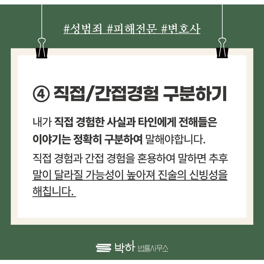 많은 사건에서 피해 당사자는 피해 사실과 관련하여 주변인들이 보고 들은 것들을 증거로써 수집하게 됩니다. 예를 들어, '사건발생 직후 가해자가 어떤 행동을 하는 것을 피해자의 친구가 보았다' 등도 주요한 증거가 될 수 있습니다. 그런데 이 때, 친구를 통해 들은 상황은 마치 피해자 본 것처럼 말하거나 명확히 구분짓지 않고 진술한다면 추후 증인신문 등 재판과정에서 문제가 발생할 가능성이 높습니다. 증인신문 등 재판 과정에서 경찰 조사 때 직접/간접경험을 명확히 구분하여 말하지 않은 사실에 대해서 말이 조금이라도 바뀐다면 피해자 진술의 신빙성이 떨어진다고 판단할 것입니다. 따라서 진술 시에는 내가 경험한 것과 전해들은 것은 확실하게 구분하여 진술하는 것을 권장드립니다.