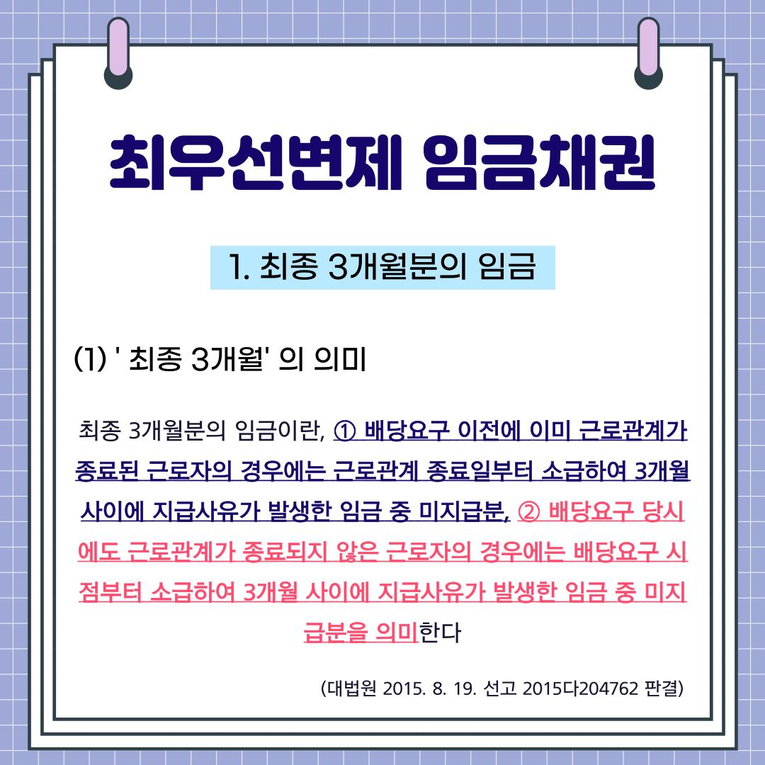 여기서 최종 3개월분의 임금이란, ① 배당요구 이전에 이미 근로관계가 종료된 근로자의 경우에는 근로관계 종료일부터 소급하여 3개월 사이에 지급사유가 발생한 임금 중 미지급분,② 배당요구 당시에도 근로관계가 종료되지 않은 근로자의 경우에는 배당요구 시점부터 소급하여 3개월 사이에 지급사유가 발생한 임금 중 미지급분을 말합니다. (대법원 2015. 8. 19. 선고 2015다204762 판결)