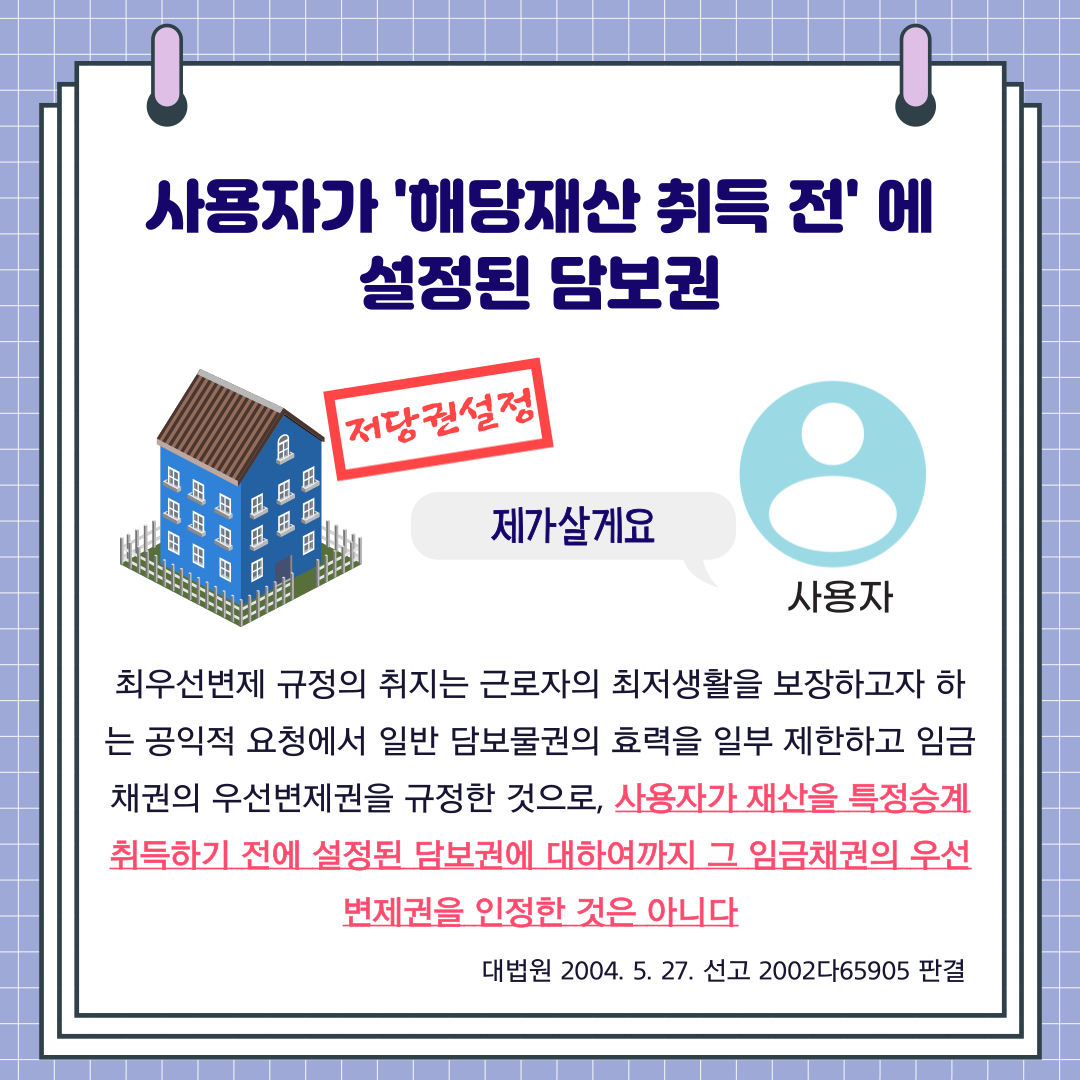 대법원은 최우선변제 규정의 취지는 근로자의 최저생활을 보장하고자 하는 공익적 요청에서 일반 담보물권의 효력을 일부 제한하고 임금채권의 우선변제권을 규정한 것으로, 사용자가 재산을 특정승계 취득하기 전에 설정된 담보권에 대하여까지 그 임금채권의 우선변제권을 인정한 것은 아니라고 판시하였습니다. 따라서, 사용자가 해당재산 취득 전에 이미 은행이나 담보권자에 의해 저당권이 설정되었다면 해당 저당권이 선순위 채권입니다.