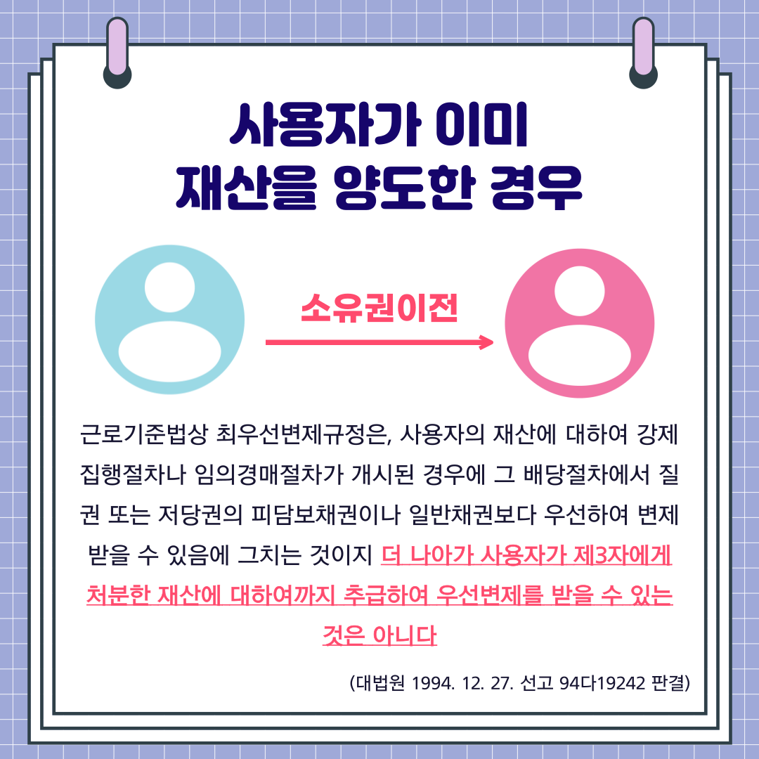 대법원은, 근로기준법상 최우선변제규정은 사용자의 재산에 대하여 강제집행절차나 임의경매절차가 개시된 경우에 그 배당절차에서 질권 또는 저당권의 피담보채권이나 일반채권보다 우선하여 변제받을 수 있음에 그치는 것이지 더 나아가 사용자가 제3자에게 처분한 재산에 대하여까지 추급하여 우선변제를 받을 수 있는 것은 아니라고 판시하였습니다. (대법원 1994. 12. 27. 선고 94다19242 판결)