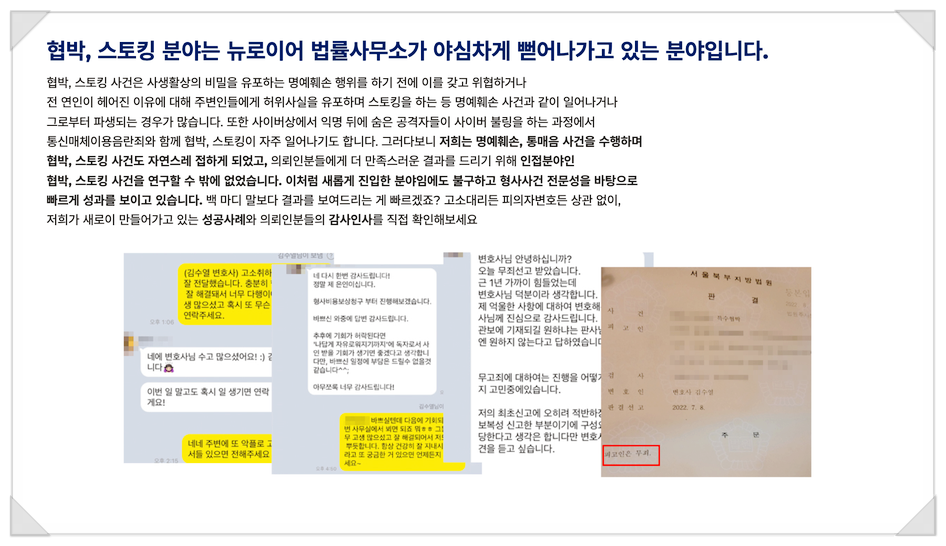 스토킹, 불안감조성, 협박 사건에서 다수의 무혐의를 이끌어봤기에 자신 있게 말씀드릴 수 있는 것 같습니다.