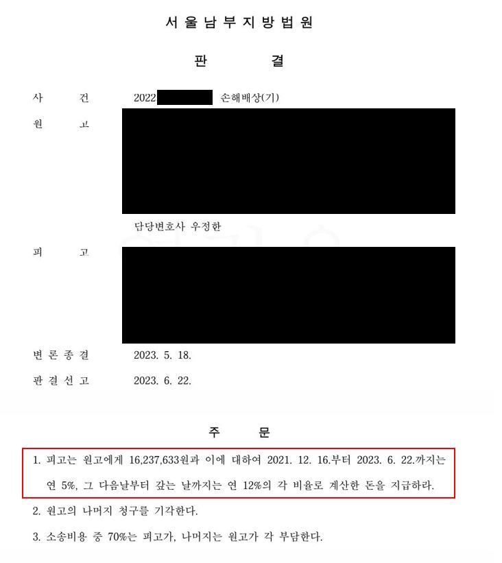 참 길었고 손해를 증명하기 까다로운 소송이지만 재판부가 상대방의 불법행위를 인정하여 위와 같은 판결을 받았습니다. 이렇게 하여 본 변호사는 블랙박스 설치 하자로 인한 공격과 방어 모두를 경험하였고, 두 사건 모두 승소하였습니다.