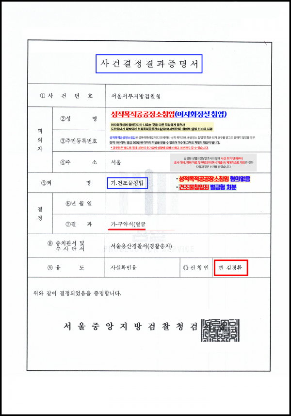 *죄명 : 건조물침입 벌금 (성적목적공공장소침입 무혐의)