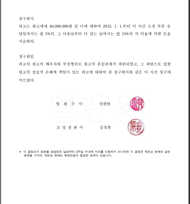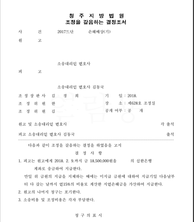 상대방이 이혼 후 저희측 의뢰인(상간자)인 피고에게 4,000여만원을 손해배상으로 청구하였고 이에 관하여 1,850만 원으로 조정이 된 사안.