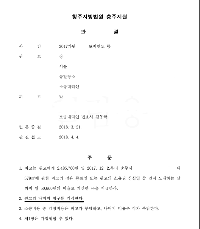 상대방의 건물철거 및 토지인도 청구에 법정지상권으로 항변하여 건물철거 청구가 기각된 사안입니다.