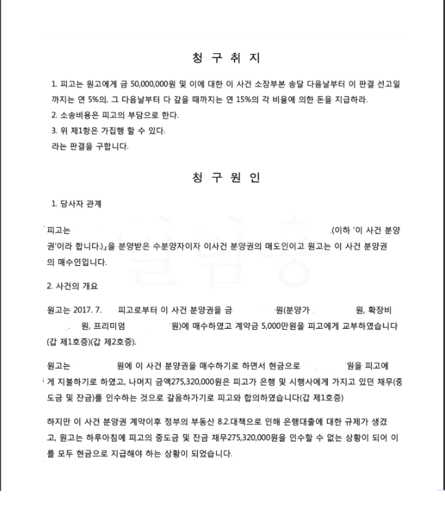 부동산 8.2. 대책으로 분양권의 매수인이 매도인의 중도금을 승계할 수 없게 되어 매수인은 본의 아니게 계약을 해제하게 되었고, 계약금 5,000만원을 돌려 받지 못한 사안입니다. 분양권 매수인인 원고가 몰수 당한 5,000만원이 과다하다 생각되어 매도인에게 손해배상액의 감액을 요청하였으나 일부만(800만 원) 인정 되었습니다. 법원은 계약내용대로의 이행을 중요시하며 손해배상액의 감액을 보수적으로 보고 있었습니다.