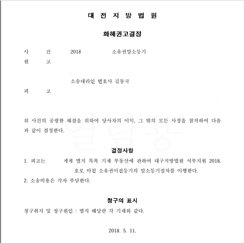 상속인 중 한명이 다른 상속인에게 소유권이전등기말소 청구를 하였고, 원고의 청구내용 그대로 화해권고 결정이 난 사안입니다.