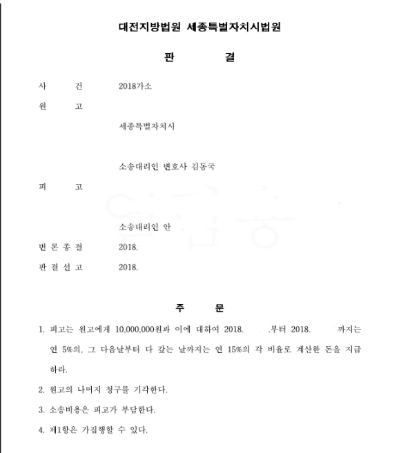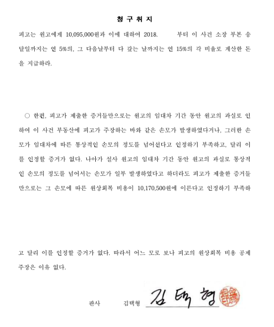 제가 임차인(원고)을 대리한 사건입니다. 임대인인 피고가 임차목적물(아파트)에 손모가 발생하였다고 주장하며 전세금의 일부를 돌려주지 않았고 저는 임차인을 대리하여 전세금 반환청구를 하였습니다. 필요비 극히 일부를 제외하고 전부 승소한 사례입니다.
