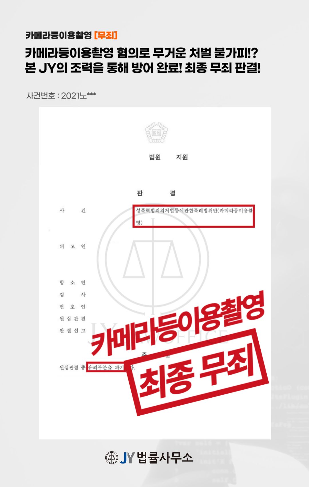 의뢰인은 이와 같은 변호인의 조력에 따라, 카메라등이용촬영의 혐의에 대해서 1심, 2심을 거쳐 최종 무죄를 선고받고 무사히 사건을 종결시킬 수 있었습니다.