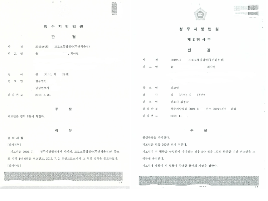 1심에서 무면허 운전으로 징역 6개월이 선고되었는데 항소심에서 변호를 맡아 벌금 300만 원으로 감형된 사안입니다.