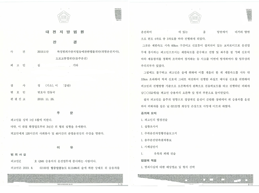 음주운전, 신호위반으로 피해자가 사망하였지만 집행유예로 나온 사안입니다.