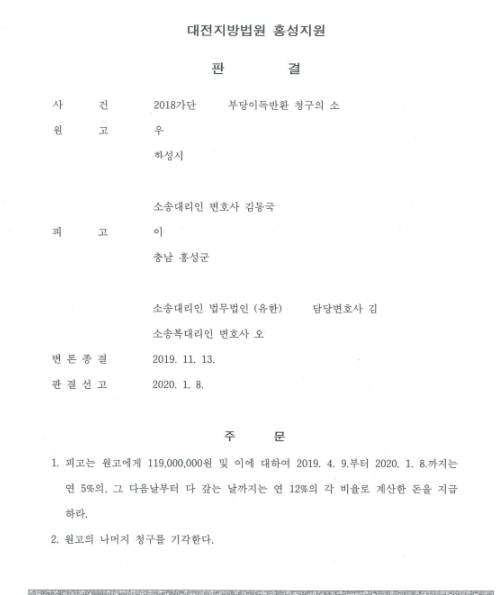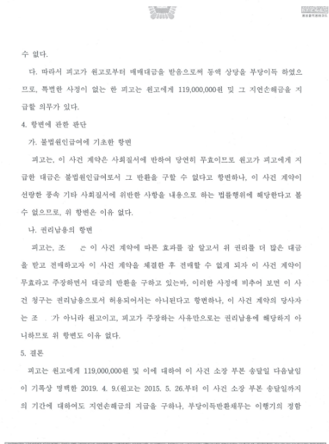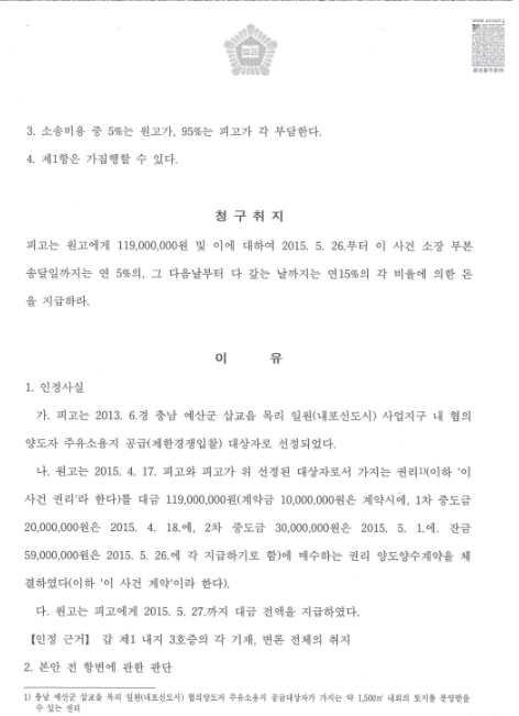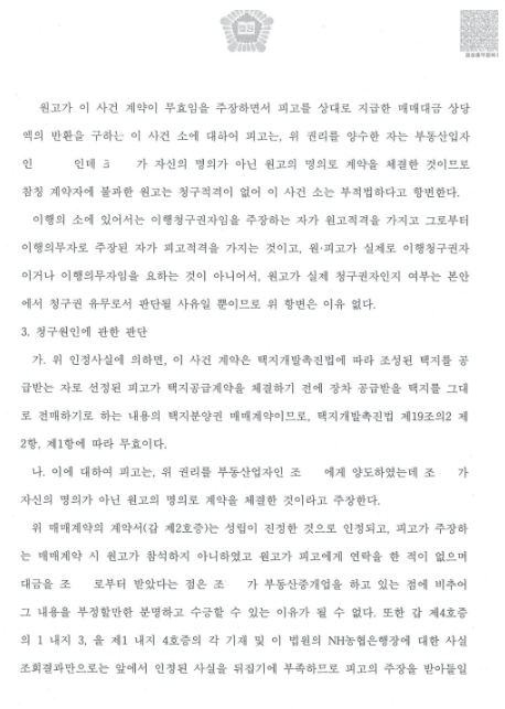 판례에 따라서 제가 진행한 사건의 판결이 있습니다. 택지개발촉진법에 따라 수분양계약전에 한 전매행위는 무효가 되고 매매대금은 부당이득반환 청구에 따라 반환청구가 가능하다는 판결입니다. 또한 무효가 된 매매행위에 따라 매도인에게 지급한 금전은 불법원인급여가 되기 힘들다고 판단하여 이주자택지 소송에서는 유의미한 판결이 될 것 같습니다.