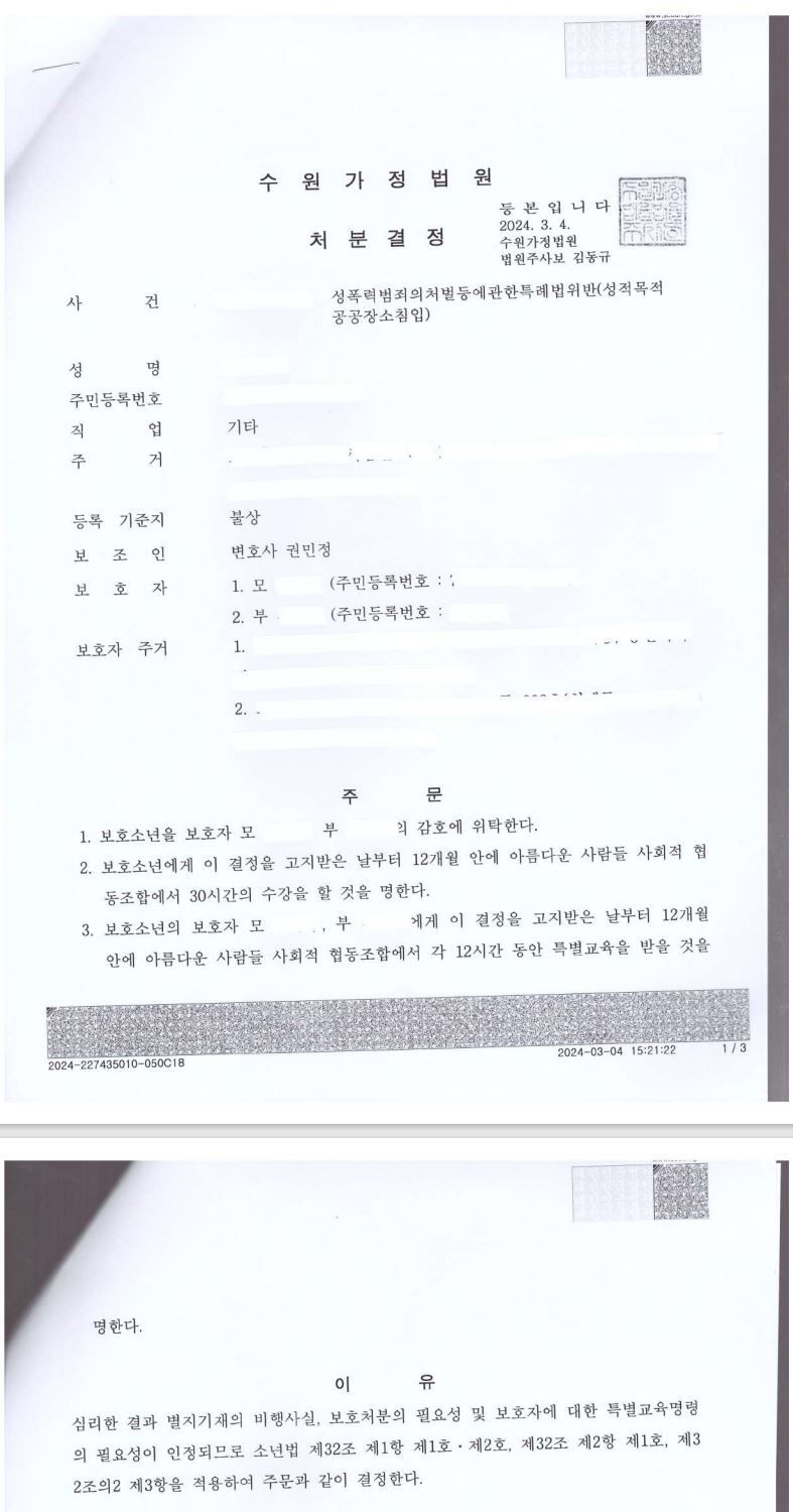 위 죄명이 성범죄이므로, 4호처분까지는 나올 수 있는 상황이었으나 각종 양형자료로 '사실상 가장 낮은 처분'인 1,2호 소년보호처분을 받은 사례입니다.