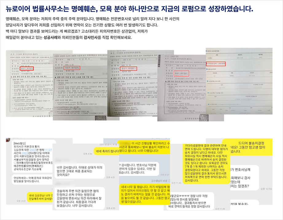 그리하여 명예훼손 사건을 특화 해오며 아래와 같이 다수의 무혐의를 이끌어온 로펌으로서