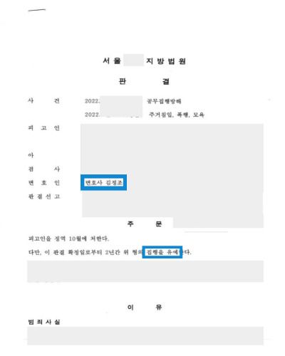 변호인의 노력 끝에 집행유예로 방어할 수 있었습니다.