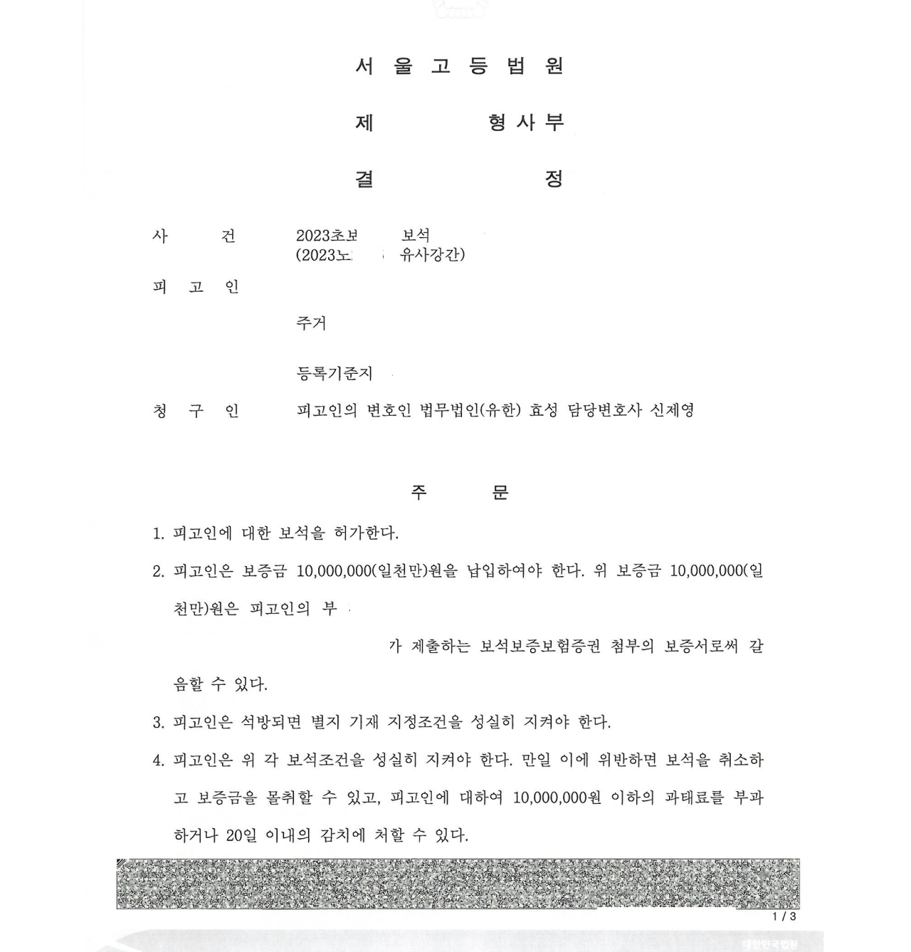 저는 즉각 보석신청서를 제출하면서 이 사건의 경위, 피고인의 가정환경, 자백 여부, 반성 여부, 피고인의 건강 상태 등을 중점적으로 주장 소명하였고 법원은 보석신청을 받아들여 피고인을 석방하였습니다.