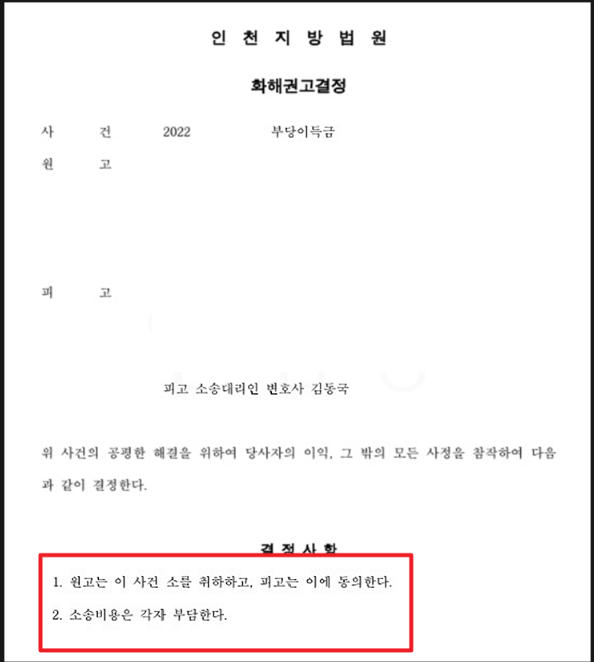 이에 결국 재판부는 피고의 전부 승소에 해당하는 '화해권고결정'을 내렸고 피고 무사히 일상으로 복귀하시게 되었습니다.