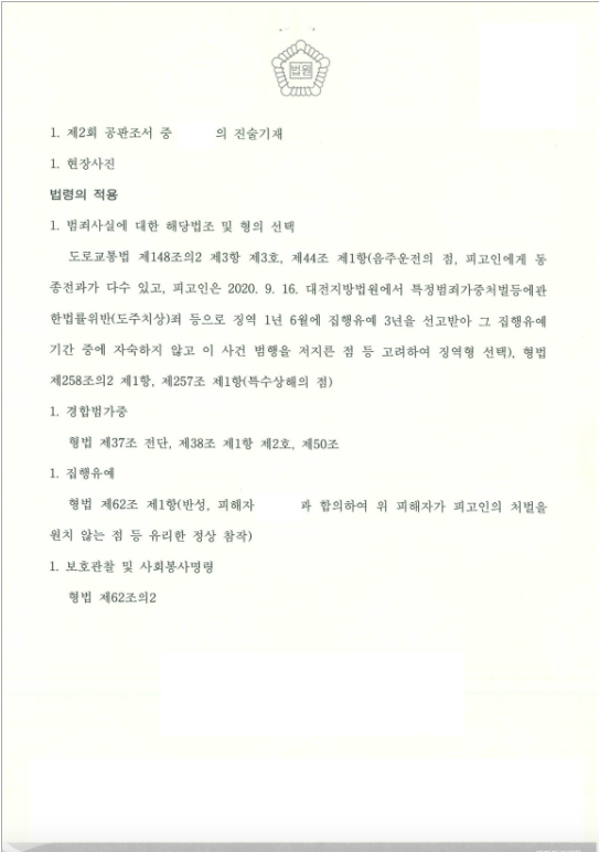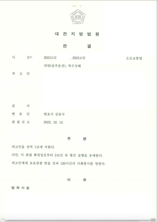 그렇게 오랜 양형조사와 변론을 거쳐 결과적으로는 불가능할 것으로 보였던 집행유예를 받는데 성공하였는데요. 많은 사건들을 다뤄봤던 음주운전변호사지만 상황이 워낙 좋지 않다보니 결과에 대해 확신을 가지기는 어려운 상황이었습니다. 그러나 의뢰인께서 정말로 객관적으로 보아도 진지하고 성실하게 반성하는 태도와 모습을 보여주셨으며 변호인으로서 제시해드리는 모든 방안을 잘 따라와 주셨기 때문에 최선의 결과가 나올 수 있었다는 생각이 듭니다.
