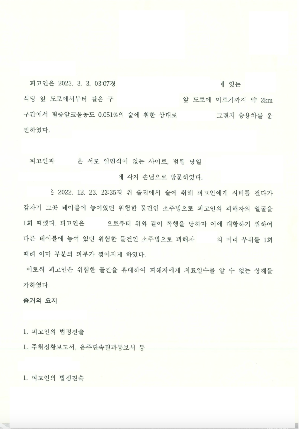 사실 사안은 굉장히 심각한 상황이었는데요. 의뢰인은 혈중알코올농도 0.051%의 수치가 나오는 상태로 음주운전을 하였으며, 이 사실에 더하여 술집에서 만나 일면식도 없는 피해자와의 다툼 중 상해를 가한 혐의로 도로교통법 위반, 특수상해 혐의로 기소되었습니다.